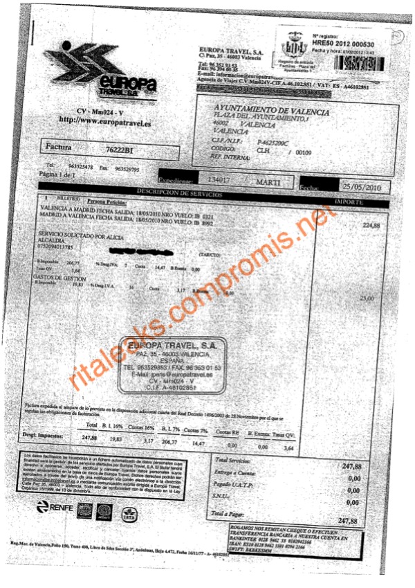 403 | 100-250 | Rita Barbera Nolla | Madrid | Europa Travel S.A. | 2012101 1/10/2012 | 20121019 19/10/2012 | 117,99€ | Bitllet de tren | |